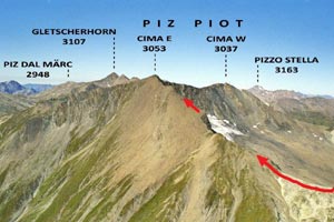 Da Juf si segue il sentiero che in direzione SE risale la valle dello Jufer Rhein. Si prosegue a sinistra (salendo) del torrente anche quando terminano le tracce di sentiero, giungendo nei pressi della (q. 2397 m). Qui si abbandona il corso del torrente (vedi prima immagine di dettaglio) e, verso S, si sale un ripido ma facile pendio morenico e roccioso. Giunti quasi al suo termine si volge a sinistra e si supera un altro pendio che conduce all´evidente sella dello Jufer Joch (q. 2766 m). Da questo ampio valico si prosegue sulla dorsale detritica NE del Piz Piot. Verso l’alto la cresta diventa ripida e stretta e la si supera appoggiando a sinistra o sul filo di cresta, fino a raggiungere la vetta, la Cima E.