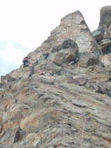 Tenedosi nei pressi delle pareti che a sinistra delimitano il canalone sottostante le belle placche iniziali visibili già dalla strada, si risalgono i ripidi pendii di erba e pietrame lungo una traccia ben segnalata con ometti. Rimontati infine alcuni gradoni vegetati, si giunge all´ attacco, posto un poco a sinistra di un tettuccio nerastro (30´). L1: Si rimonta al suo centro la placca di facili gradoni (III), obliquando verso sinistra in direzione di un piccolo tetto sino ad uscire sullo spigolo (IV, 1 ch). Se ne segue il filo per alcuni metri (IV/IV+, 1 ch) sino ad una vecchia sosta, 2 chiodi con anello, da cui per facile cengia a destra sino alla base di una compatta placca, sosta su 2 spit con cordino (40 m). L2: Con arrampicata di aderenza, si supera la placca chiodata piuttosto lunga sulla verticale della sosta (IV/IV+), oppure dopo il primo spit si piega a sinistra a prendere una bella fessura, più facile ma sprotetta (III), al cui termine si aggira a sinistra uno strapiombino, riportandosi quindi per cengia sulla linea degli spit seguendo la quale (IV) si arriva in sosta, 2 spit con cordino (40 m). L3: Si rimonta facilmente la rampa di sinistra (III, chiodo), e una volta sullo spigolo, se ne segue il filo superando due bei risalti, passi di III-IV. La sosta si effettua su un solido larice con cordone e maillon, ma è preferibile proseguire facilmente per erba sino alla sommità della crestina, dove su una roccia si trova una sosta nuova (2 spit con catena e anello di calata, 60 m). L4: Dalla sosta nuova si scende brevemente per traccia, scavalcando un punto franato, quindi piegando a destra ci si porta sotto ad un breve diedro che si scala con passo atletico (III+, altre relazioni parlano di un chiodo ma l´ autore non l´ ha visto, tuttavia una bella fessura orizzontale consente di posizionate un sicuro friend). Superato il diedro, si prosegue a destra per cengia sino ad un risalto inciso da due camini di pari difficoltà (l´ autore ha salito quello di sinistra, il suo compagno quello di destra), oltre i quali segue un tratto a gradoni orizzontale. Sosta su spuntone (45 m). L5: Proseguendo per facili blocchi, ci si porta ad una placca che si risale in prossimità del filo (III) spostandosi poi a sinistra di uno spuntone antecedente un estetico roccione triangolare, sosta su spit con catena ed anello (35 m). L6: Tenendosi sul filo, ci si porta ad una paretina solcata da una fessura a destra del roccione triangolare. La si scala con passo atletico (III+, 1 chiodo), quindi si traversa su placca ad una profonda ed estetica fessura verticale (IV, da proteggere). All´ uscita si piega a destra in piano ad un terrazzino, dove si trova la nuova sosta su spit con catena e anello di calata (40 m). L7: Tenendosi a sinistra del filo, si superano due muretti e con passaggio aereo si giunge alla vecchia sosta, poco a sinistra di un tetto. Quindi, con passo delicato soprattutto per il secondo di cordata (III+), si scende per pochi metri traversando poi più facilmenta alla base del diedro finale (sosta su spit con cordino), dove conviene sostare nonostante sia soggetto alla caduta di pietre smosse dal primo di cordata. L8: Con bella arrampicata si rimonta il diedro, quindi a destra per cengia ad una placca (chiodo sulla destra) che si rimonta preferibilmete a sinistra dov´ è più appigliata, uscendo sulla cresta sommitale. Sosta su spuntone (45 m). Non rimane ora che seguire a sinistra il crinale erboso risalendo all´ ampia vetta del Bec Raty, ometto.