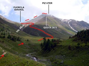 In ogni caso, dall’alpeggio si prosegue verso SE, su di un sentiero ben marcato. Raggiunto il piccolo torrente che scende dalla Val Peja, si abbandona il sentiero e si risale, su tracce discontinue e non segnalate, il costone erboso a destra (salendo) di questa valle, che rappresenta la parte inferiore della cresta NW del Piz Uter. Nella parte superiore le tracce proseguono nell’ampio avvallamento detritico che separa il Piz Arpiglia dal Piz Uter e conducono alla Fuorcla Giavagl (q. 2706 m). Volgendo ora a destra, si risalgono le facili rocce e gli sfasciumi della cresta NE, fino in vetta.