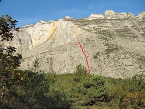 L8: salire il diedro a sinistra che adduce ad una placca fessurata. Superare direttamente la placca lungo la fessura (molto levigato) e raggiungere il terrazzo di sosta (35 m, V, sosta comoda).