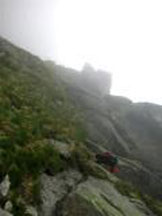 | La salita centrale su roccette (I+) dalla forcella, vista scendendo | Si percorre (ovest) una cengia erbosa che porta ad un camino | Ccamino sotto ad una parete verticale |