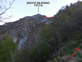 Ci si abbassa poi ad una selletta e subito dopo (vedi immagine principale) si affronta un ripido ma breve risalto roccioso attrezzato con catene. Si continua lungo la cresta su sentiero segnalato e senza particolari difficoltà, fino a un’impennata rocciosa, dove sono state posate 2 scale metalliche. Si aggira questo tratto a destra, sempre su sentiero segnalato e compiendo un percorso a semicerchio si ritorna sulla cresta SE a monte delle scale. Con un ultimo strappetto in parte roccioso e in parte erboso si arriva in vetta allo Zucco Sileggio (q. 1373 m, h 2.30) dove c´è un’alta croce in metallo.