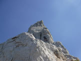 L2: A questo punto si attacca la cresta vera e propria: seguire il facile ma esposto filo di cresta fino a raggiungere un muro compatto e patinato solcato da una piccola fessura. Vincere il muro (la chiodatura ravvicinata è di aiuto) fino a raggiungere la successiva comoda sosta (5c).