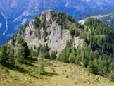 Superato il cancelletto della recinzione per le mucche presso la forcella, seguire verso sinistra la traccia che attraversa il pendio erboso con larici, fino a dove termina presso il recinto. Scavalcare il filo della recinzione e proseguire lungo il lato sinistro della cresta erbosa fin dove termina. Scendere a sinistra aggirando delle rocce franose verso destra e risalire alla cresta, seguendola poi con percorso un po' disagevole fra pini cembri e tronchi, passando sotto una grande radice ad arco. Scavalcando alcuni tronchi di alberi caduti e seguendo la scarsa traccia sul terreno di terra e erba fra i pini si giunge al pendio di zolle erbose sotto la cima, risalendo il quale con breve tratto ripido si raggiunge la croce di legno sulla panoramica vetta.
