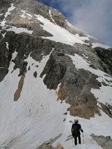 Dal parcheggio seguiamo verso nord la strada forestale con segnavia 557 fino alla partenza della teleferica del Rif. Torrani. Da qui prendiamo il sentiero 558 che faticosamente porta alla Forcella delle Sasse. Dalla forcella si prende la traccia in direzione nord che, perdendo circa una cinquantina di metri di quota, costeggia per ghiaie tutto il Van delle Sasse fino all´attacco della ferrata, ben indicato con grandi bolli rossi. La ferrata inizia quasi da subito a farsi tosta in quanto costantemente verticale e con dei passaggi esposti e non proprio banali, oltre ad una parte costantemente bagnata. Usciti dalla ferrata ci ritroviamo sul Pian della Tenda con, alla nostra sinistra, l´imponente cima della Civetta e più sotto il rif. Torrani. Qui abbiamo calzato i ramponi e salendo alla forcelletta abbiamo iniziato (direzione sud), la salita della cresta nevosa che con pendii di 40/45° porta all´anticima e successivamente, con un paio di saliscendi, alla Cima di Tomè (tracce e ometti pp II).