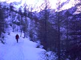Parcheggiata l'auto a Villanova, ultimo paese raggiungibile su asfalto della Val Pellice, nei pressi di un primo tornante sterrato superare a piedi un ponte posto ai piedi di una bellissima cascata che d'inverno ci fa intuire che da queste parti la possibilità di effettuare scalate su ghiaccio è tutt'altro che remota. Percorrendo la stradina che si inoltra nel piccolo paese di Villanova pssiamo accanto ad un Bar-Ristorante chiamato Rifugio Barbara. Da qui il sentiero si fa più stretto e dopo una fontana inizia a scendere e ad essere ben segnalato con segni di vernice bianco-rossi che identificano il sentero EPT 115 GTA. Dopo la beve discesa iniziale il sentiero risale dolcemente per poi effettuare un piccolo scollinamento che ci porta in un punto pianeggiante dove d'inverno dobbiamo porre molta attenzione a superare uno spesso strato ghiacciato che occupa l'intero sentiero. Superato un altro ponte il sentiero si fa finalmente più interessante prendendo a salire mezzacosta alla base di ripidi paretoni rocciosi. Interessante da questi punti è lo scorcio offerto sul fondovalle e su Villanova. Con due lunghi tratti mediamente ripidi si riguadagna il tracciato stradale in un punto in cui lo stesso è scavato nell roccia. Seguendo le chiare indicazioni deviamo verso sinistra e percorriamo la strada che con un percorso abbastanza dolce e mai faticoso ci guida a risalire questo strettissimo punto della vallata.